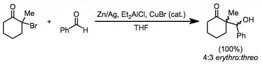 Alkylation of enolates generated through the reduction of monohalo ketones is limited to the most reactive alkyl halides.[14] However, reduction in the presence of an aldehyde leads to reductive aldol products, analogous to the Reformatsky reaction of haloesters. Zinc dust may be used alone; or as an amalgam, in combination with diethylaluminum chloride, or with catalytic amounts of copper(I) bromide.[15]