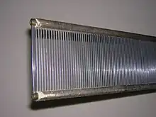 Both the wires and the slots in the reed are known as dents[7] (namely, teeth).[5] The warp threads pass through the dents after going through the heddles and before becoming woven cloth.[1] The number of dents per inch (or per cm or per 10 cm) indicates the number of gaps in the reed per linear width. The number of warp thread ends by weaving width determines the fineness of the cloth.[3] One or more warp threads may pass through each dent. The number of warp threads that go through each dent depends on the warp and the desired characteristics of the final fabric, and it is possible that the number of threads in each dent is not constant for a whole warp.[6] The number of threads per dent might not be constant if the weaver alternates 2 and three threads per dent, in order to get a number of ends per inch that is 2.5 times the number of dents per inch, or if the thickness of the warp threads were to change at that point, and the fabric to have a thicker or thinner section.
