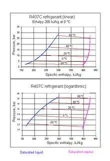 R407C pressure-enthalpy diagram, isotherms between the two saturation lines
