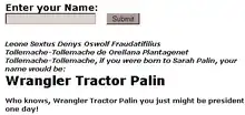 A Comedy Central writer joked that "she's a pit bull who wears lipstick for some reason!" (in response to her statement at the 2008 Republican National Convention that the difference between a pit bull and a hockey mom was lipstick).[162] In addition, David Harrington's "Sarah Palin Baby Name Generator"[163] generates hunting, industrial, hockey-related, and other idiosyncratic personal names from names that are supplied to it.[164]