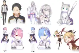The central characters of the series. First row, from left: Subaru Natsuki, Emilia, and Puck. Second row, from left: Ram, Rem, and Felt.