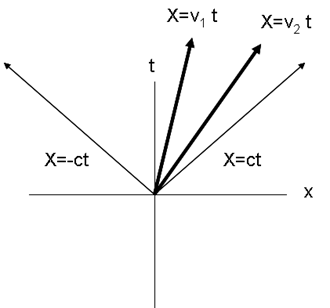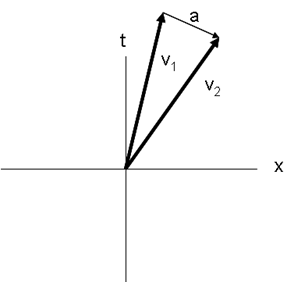 The velocity vectors in spacetime for a particle at two different speeds. In relativity an acceleration is equivalent to a rotation in spacetime