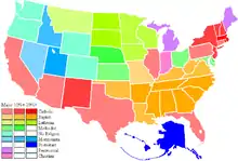 Plurality of religious preference by state, 2001. Data is unavailable for Alaska and Hawaii.