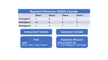 This figure is an example of a repeated measures design that could be analyzed using a rANOVA (repeated measures ANOVA). The independent variable is the time (Levels: Time 1, Time 2, Time 3, Time 4) that someone took the measure, and the dependent variable is the happiness measure score. Example participant happiness scores are provided for 3 participants for each time or level of the independent variable.