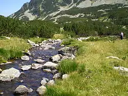The river takes its source from Pirin's largest and deepest glacial lake, Popovo, at an altitude of 2,234 m. At an altitude of 2,174 m near the Fish Popovi Lakes it is joined by two mountain streams — one from the north sloping down the summit of Polezhan (2,851 m), and one from the west coming from the Polezhanski Lakes. Further downstream another stream coming from the Kremenski Lakes flows into the Retizhe. It then flows in north-eastern direction in a deep valley, forming rapids and small waterfalls.[1] Downstream the valley becomes deeper and is covered with dense forests. Some four kilometres before its mouth the Retizhe turns in eastern direction and forms a deep impassable canyon. It flows into the Mesta at Momina Klisura Gorge at an altitude of 646 m near the village of Mesta, Bansko Municipality.[1][2] The village is the only settlement along the course of the river.