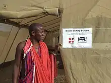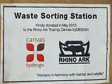 One of the main environmental challenges of organising an event with close to 3,000 participants and spectators in the most remote wilderness areas of Kenya is the management of waste. Keeping with Rhino Ark's conservation mission, the Rhino Charge Committee is committed to leaving each venue as it was found. To this end, stringent rules have been set by the Committee to ensure that no waste is left in the entire Rhino Charge venue. This includes a fine system that is strictly implemented to address wastes by competitors. In addition, with the support of key sponsors, wastes are collected across the venue, including in the Spectator Camp and at the Gauntlet. To promote waste recycling, a Waste Sorting Station is set up at the venue. Glass, cans and tins, plastic bottles, among others, are separated and brought back to Nairobi for recycling. In the 2013 event, almost 50 cubic metres of waste were properly sorted and removed from the venue for recycling.[11]