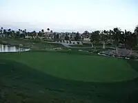 The Rhodes Ranch Golf Club opened on November 6, 1997, with little fanfare.[24][25] It was designed by Ted Robinson, and was open to the public. The 135-acre course featured eight lakes, and was the centerpiece of the Rhodes Ranch community.[25] The course was later increased to 162 acres,[26] and it includes more than 3,500 palm trees.[27] The community's entrance includes a "Rhodes Ranch" sign spelled out in giant letters like the Hollywood Sign.[28] Rhodes Ranch became one of the most successful master-planned communities in the Las Vegas Valley.[29]