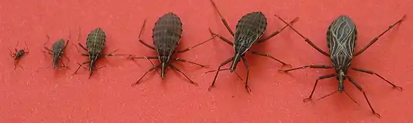 The insect has five larval stages, with a moult between each. Each larval stage consumes a single large meal of blood, which triggers the moulting process, 12–15 days later. Wigglesworth demonstrated that the moult is started by prothoracicotropic hormone (PTTH) secreted into the blood in response to hormone release by neurosecretory cells in the brain.[4] Further it was demonstrated that the corpora allata secrete the juvenile hormone which prevents the premature development into an adult. The removal of the head during any larval stage causes early development into an adult, whereas the implantation of a juvenile head during the fifth larval stage results in a giant sixth stage larva.[5]