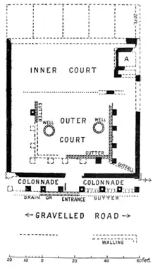 "The first discovery of the Principia is due to Miss Greenall, who about 1905 was building a house close to the school and took care that certain remains found by her builders should be duly noted: excavations in 1906-07, however, left the size and extent of these remains somewhat uncertain and resulted in what we now know to be an incorrect plan. The work done last spring (1913) makes it plain (see illustration) that the Principia fronted — in normal fashion — the main street of the fort (gravel laid on cobbles) running from the north to the south gate. But, abnormally, the frontage was formed by a verandah or colonnade: the only parallel which I can quote is from Caersws, where excavations in 1909 revealed a similar verandah in front of the Principia. Next to the verandah stood the usual Outer Court with a colonnade round it and two wells in it (one is the usual provision): the colonnade seemed to have been twice rebuilt. Beyond that are fainter traces of the Inner Court which, however, lies mostly underneath a churchyard: the only fairly clear feature is a room (A on plan) which seems to have stood on the right side of the Inner Court, as at Chesters and Ambleside. Behind this, probably, stood the usual five office rooms. If we carry the Principia about twenty feet further back, which would be a full allowance for these rooms with their walling, the end of the whole structure will line with the ends of the granaries found some years ago. This, or something very like it, is what we should naturally expect. We then obtain a structure measuring 81 × 112 feet (34 m), the latter dimension including a verandah 8 feet (2.4 m) wide. This again seems a reasonable result. Ribchester was a large fort, about 6 acres (24,000 m2), garrisoned by cavalry; in a similar fort at Chesters, on Hadrian's Wall, the Principia measured 85 × 125 feet (38 m): in the 'North Camp' at Camelon, another fort of much the same size (nearly 6 acres), they measured 92 × 120 feet (37 m)."