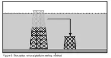 • Toppling: Toppling involves uses explosives to sever the base of the structure below the mud line in a matter such that it simply falls over. Toppling eliminates shallow and mid-ocean habitats. These portions of the rig are quickly occupied by other creatures.[16]