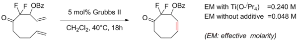 Additives are also used to overturn conformational preferences, increase reaction concentration, and chelate highly polar groups, such as esters or amides, which can bind to the catalyst.[2] Titanium isopropoxide (Ti(OiPr)4) is commonly used to chelate polar groups to prevent catalyst poisoning and in the case of an ester, the titanium Lewis acid binds the carbonyl oxygen. Once the oxygen is chelated with the titanium it can no longer bind to the ruthenium metal of the catalyst, which would result in catalyst deactivation. This also allows the reaction to be run at a higher effective concentration without dimerization of starting material.[48]