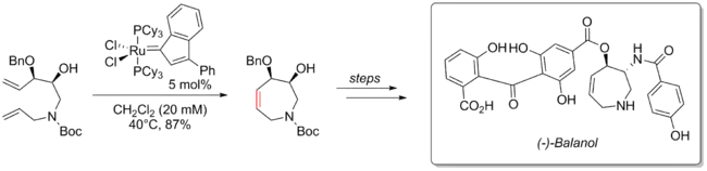 In 2000, Alois Fürstner reported an eight step synthesis to access (−)-balanol using RCM to form a 7-member heterocycle intermediate. Balanol is a metabolite isolated from erticiullium balanoides and shows inhibitory action towards protein kinase C (PKC). In the ring closing metathesis step, a ruthenium indenylidene complex was used as the precatalyst to afford the desired 7-member ring in 87% yield.[55]