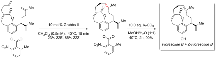 Ring-closing metathesis is important in total synthesis. One example is its use in the formation of the 12-membered ring in the synthesis of the naturally occurring cyclophane floresolide. Floresolide B was isolated from an ascidian of the genus Apidium and showed cytotoxicity against KB tumor cells. In 2005, K. C. Nicolaou and others completed a synthesis of both isomers through late-stage ring-closing metathesis using the 2nd Generation Grubbs catalyst to afford a mixture of E- and Z- isomers (1:3 E/Z) in 89% yield. Although one prochiral center is present the product is racemic. Floresolide is an atropisomer as the new ring forms (due to steric constraints in the transition state) passing through the front of the carbonyl group in and not the back. The carbonyl group then locks the ring permanently in place. The E/Z isomers were then separated and then the phenol nitrobenzoate protective group was removed in the final step by potassium carbonate to yield the final product and the unnatural Z-isomer.[52]