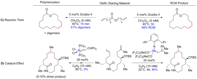 Catalyst choice (D) has also been shown to be critical in controlling product formation. A few of the catalysts commonly used in ring-closing metathesis are shown below.[11][39][40][41]