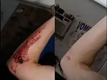 Road rash is a colloquial term for skin injury caused by abrasion with road surfaces, often as a consequence of cycling and motorcycling accidents. It may also result from running, inline skating, roller skating, skateboarding, and longboarding accidents.