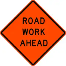 An orange diamond sign for upcoming roadworks. The worded legend shown here is banned by the 1968 Vienna Convention on Road Signs and Signals, but is allowed in the 2009 Manual on Uniform Traffic Control Devices.