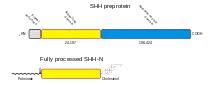 SHH undergoes a series of processing steps before it is secreted from the cell. Newly synthesised SHH weighs 45 kDa and is referred to as the preproprotein. As a secreted protein, it contains a short signal sequence at its N-terminus, which is recognised by the signal recognition particle during the translocation into the endoplasmic reticulum (ER), the first step in protein secretion. Once translocation is complete, the signal sequence is removed by signal peptidase in the ER. There, SHH undergoes autoprocessing to generate a 20 kDa N-terminal signaling domain (SHH-N) and a 25 kDa C-terminal domain with no known signaling role.[85] The cleavage is catalysed by a protease within the C-terminal domain. During the reaction, a cholesterol molecule is added to the C-terminus of SHH-N.[86][87] Thus, the C-terminal domain acts as an intein and a cholesterol transferase. Another hydrophobic moiety, a palmitate, is added to the alpha-amine of N-terminal cysteine of SHH-N. This modification is required for efficient signaling, resulting in a 30-fold increase in potency over the non-palmitylated form and is carried out by a member of the membrane-bound O-acyltransferase family Protein-cysteine N-palmitoyltransferase HHAT.[88]