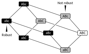 A network of genotypes linked by mutations. Each genotype is made up of 3 genes: a, b & c. Each gene can be one of two alleles. Lines link different phenotypes by mutation. The phenotype is indicated by colour. Genotypes abc, Abc, aBc and abC lie on a neutral network since all have the same, dark phenotype. Genotype abc is robust since any single mutation retains the same phenotype. Other genotypes are less robust as mutations change the phenotype (e.g. ABc).