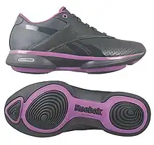 A rocker sole shoe or rocker bottom shoe is a shoe which has a thicker-than-normal sole with rounded heel. Such shoes ensure the wearer does not have flat footing along the proximal-distal axis of the foot. The shoes are generically known by a variety of names including round bottom shoes,[1] round/ed sole shoes,[2] and toning shoes,[3] but also by various brand names.[4] Tyrell & Carter identified at least six standard variations of the rocker sole shoe and named them: toe-only rocker, rocker bar, mild rocker, heel-to-toe rocker, negative heel rocker and double rocker.[1]