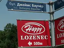 The new system is not always used properly. One of these signposts in Sofia shows the name of the district of Lozenets written according to the international scientific system of transliteration (c = ts), but in the other the name of the Irish journalist James Bourchier has been "relatinised" according to the official Bulgarian system (Dzheyms Baucher), even though the system does not apply to names that have authentic Roman spellings.