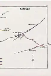 The first line proposed to link Romford to the north shore of the River Thames was put forward by the Thames Haven Railway and Dock Company who proposed a 16 miles (26 km) line from Romford to Shell Haven. An Act of Parliament was obtained in 1836 and powers were renewed 10 years later but no work was ever commenced.[3]