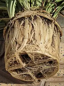 A root ball[1] is the mass of roots and growing media at the base of a plant such as trees, shrubs, and other perennials and annual plants.[2] The appearance and structure of the root ball will be largely dependent on the method of growing used in the production of the plant. The root ball of a container plant will be different than that of the field-harvested “ball and burlap” tree.[3] The root ball is of particular significance in horticulture when plants are being planted or require repotting as, the quality, size, and preparation of the root ball will heavily determine how well the plant will survive being transplanted and re-establish in its new location.[4]
