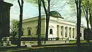 Built in the Grecian style with some Roman features, the library is a two-story, brick, rectangular building faced in marble with a centrally placed octagonal dome.[8] The dome creates a three-story octagonal rotunda, which is the principal interior feature. The main rotunda features bronze zodiac signs inlaid in the marble floor. These signs were done by James C. Kindlund. On the dome above there are four personified figures representing History, Romance, Religion and Science. These are interspersed with more figures personifying Fable, Drama, Lyric and Epic poetry. Each of the figures has the names of two famous individuals who embody that field of knowledge. Fable is surrounded by La Fontaine and Aesop, Religion has St. John and Moses, Lyric has Milton and Virgil, Epic Poetry has Homer and Dante, Science has Darwin and Newton, Drama has Shakespeare and Molière and Romance has Scott and Dumas. The inscription on the frieze under the dome states "To know wisdom and instruction: to perceive the words of understanding".[9] As you enter the library from the front, the words "Salve," Latin for "Welcome" and "Vale," Latin for "Farewell," are inscribed into the marble floor. To the right and left of the rotunda on the first floor are two large reading rooms, as well as two exhibition areas. These display areas showcase antiques featuring local author Marietta Holley, as well as items relating to the French emigres who once lived in the north country.[9] The architects hired for the building were Orchard, Lansing & Joralemon of Niagara Falls, and supervising architect, Mr. A. F. Lansing. The architect of the art was Mr. Charles Rollinson Lamb and the interior decorators were J & R Lamb.[10] One of the unique components of the original library was its separate Children's Room which was set away from the adult areas and was donated by Mrs. Taylor as a way to commemorate her eldest son who died in infancy.[9] A Genealogy department, local history archives and meeting rooms are located in the top floor of the building.[11]