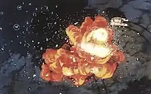 Critiquing his own work on Royal Space Force, Ogura expressed a wish that he had been able to convey more emphasis on the effects of light and shadow in addition to color, but joked that it was hard to say exactly how things would turn out until he actually painted them, something he said was true of the entire film.[140] Ogura remarked that many of his team were veterans of Sanrio's theatrical films unit, which gave him confidence in their abilities; mentioning the role of former Sanrio artist, future Gankutsuou art director Hiroshi Sasaki, in the visionary sequence occurring after Shirotsugh's orbiting spacecraft crosses from the world's nightside to its dayside, referred to in production as its "image scene."[141] Akai discusses the involvement as well in this sequence of the future director of Gankutsuou, Mahiro Maeda.[142] Okada judged that the image scene was the only place in the film appropriate to the talent of Maeda, whom he called a "true artist." Anime, Okada argued, was like a reactor that harnessed Maeda, whose artistic talent Okada compared to that of a nuclear blast, for the mundane purpose of boiling water; he asserted that when Maeda had worked before Royal Space Force on Castle in the Sky, not even Hayao Miyazaki had been able to employ his talent properly.[143]