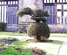 A freestanding, carved wooden screen made of bog oak in the Great Hall probably dates from between 1530 and 1540. It is described by Pevsner as being "of an exuberance of decoration matched nowhere else in England",[6] and is the only known surviving example from the first half of the 16th century. It stands at the north end of the great hall, covering the entrance to the original kitchens.[9] It has three spiral finials, two outer ones carved from single lengths of timber at the sides of the screen framing eight traceried panels. On the top-rail are two angels, a male and female, bearing shields with the arms of Fitton and Banastre families.[1] Two horizontal rails are morticed into the uprights. Three errors were possibly incorporated by its makers to avoid a charge of heresy, as a contemporary belief was that God alone could create perfection. One panel on the hall side is upside down, on the opposite side one panel has a different pattern and an angel has an extra finger.[9]