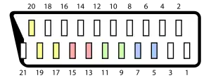 There is also a Japanese version of the SCART connector, which is referred to as the Japanese RGB-21 connector, EIAJ TTC-003,[14] or simply JP-21. This version of SCART uses similar signals and the same connector, but it has a different pinout. In Japan and Korea, it is commonly called RGB-21 while it is more generally called JP-21 in the English-speaking world.