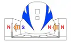 As the train accelerates, the magnetic fields of its superconducting magnets induce a current into these coils due to the magnetic field induction effect. If the train were centered with the coils, the electrical potential would be balanced and no currents would be induced. However, as the train runs on rubber wheels at relatively low speeds, the magnetic fields are positioned below the center of the coils, causing the electrical potential to no longer be balanced. This creates a reactive magnetic field opposing the superconducting magnet's pole (in accordance with Lenz's law), and a pole above that attracts it. Once the train reaches 150 km/h (93 mph), there is sufficient current flowing to lift the train 100 mm (4 in) above the guideway.[3]