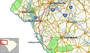 - 1 2 Google (May 18, 2016). "Overview map of SC 81 (southern end of SC 8 concurrency to Greenville)" (Map). Google Maps. Google. Retrieved May 18, 2016.