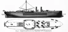 The Sachsen class was the first group of capital ships built under the tenure of General Albrecht von Stosch, the first Chief of the Imperial Admiralty. Stosch favored a coastal defense strategy for the German fleet, and the Sachsens were intended to operate from fortified ports, from which they could sortie to attack blockading fleets. They proved to be controversial in service, as critics pointed out their poor seakeeping, tendency to roll in heavy seas, and low speed compared to earlier armored frigates.[1] She was the first large, armored warship built for the German navy that relied entirely on engines for propulsion.[2]