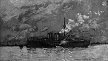 After finally entering regular service in 1880, Sachsen joined the Training Squadron of the German fleet. She was commissioned on 15 April for the year's training exercises, and was decommissioned for the winter on 27 September.[9] At that time, the German fleet was tasked primarily with coastal defense against France and Russia, who were presumed to be the most likely enemies in a continental war.[10] The ship saw little further activity in the early 1880s, as further improvements were made to the ship. She was briefly recommissioned from 15 February to 12 May 1882 for more testing, including the first firing of her main guns. KzS Max von der Goltz served as her commander during this short period in commission.[9] During this period, heightened tensions with Russia prompted the naval command developed more offensively-minded contingencies. These formed the basis for the annual summer fleet maneuvers, in which Sachsen took part.[11] The ship was recommissioned again on 22 April 1884 under the command of Korvettenkapitän (KK—Corvette Captain) Friedrich von Pawelsz, for the second time she was to join the Training Squadron. By that time, all three of her sisters had been completed and were ready to serve as a homogeneous division. Following the completion of the fleet exercises, she was decommissioned again on 30 September.[9]