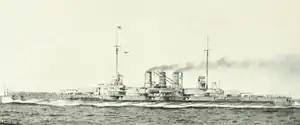 SMS Thüringen[lower-alpha 1] was the third vessel of the Helgoland class of dreadnought battleships of the German Kaiserliche Marine (Imperial Navy}. Thüringen's keel was laid in November 1908 at the AG Weser dockyard in Bremen. She was launched on 27 November 1909 and commissioned into the fleet on 1 July 1911. The ship was equipped with twelve 30.5 cm (12 in) guns in six twin turrets, and had a top speed of 21 knots (39 km/h; 24 mph). Thüringen was assigned to I Battle Squadron of the High Seas Fleet for the majority of her career, including World War I.