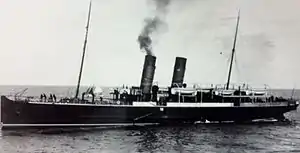 On 9 April 1917, a German submarine had penetrated to within a few miles of Liverpool and succeeded in torpedoing the American liner SS City of New York. The Tynwald, inward bound from Douglas, was just passing the Bar Light Ship[6] and was quickly on the scene. The weather at the time was far from good, a strong wind blowing with showers of snow at intervals. The passengers were conveyed in the liner's own lifeboats, which came alongside the Tynwald, and, although the sea was distinctly lumpy, causing a considerable rise and fall of the lifeboats, all were safely taken on board, including Admiral Sims of the U.S. Navy.[6]