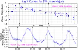 - 1 2 Robinson, Edward L.; et al. (February 1987), "Detection of Superhumps and Quasi-periodic Oscillations in the Light Curve of the Dwarf Nova SW Ursae Majoris", Astrophysical Journal, 313: 772, Bibcode:1987ApJ...313..772R, doi:10.1086/165015.