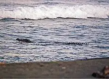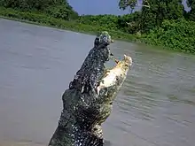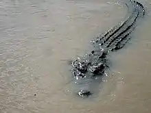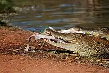 Like most species in the crocodilian family, saltwater crocodiles are not fastidious in their choice of food, and readily vary their prey selection according to availability. Nor are they voracious, as they are able to survive on relatively little food for a prolonged period. Because of their size and distribution, saltwater crocodiles hunt the broadest range of prey species of any modern crocodilian.[95] The diet of hatchling, juvenile, and subadult saltwater crocodiles has been subject to extensively greater scientific study than that of fully-grown crocodiles, in large part due to the aggression, territoriality, and size of adults that make them difficult for biologists to handle without significant risk to safety, for both humans and the crocodiles themselves. The main method used for capturing adult saltwater crocodiles is a huge pole with large hooks, meant for shark capture, that restrict the crocodile's jaws, but these can cause damage to their snouts; and even this is unproven to allow successful capture for crocodiles in excess of 4 m (13 ft 1 in). While for example 20th century biological studies rigorously cataloged the stomach contents of "sacrificed" adult Nile crocodiles in Africa,[101] few such studies were done on behalf of saltwater crocodiles despite the plethora that were slaughtered due to the leather trade during that time period. Therefore, the diet of adults is more likely to be based on reliable eye-witness accounts.[102][103][104] Hatchlings are restricted to feeding on smaller animals, such as small fish, frogs, insects and small aquatic invertebrates.[103] In addition to these prey, juveniles also take a variety of freshwater and saltwater fish, various amphibians, crustaceans, molluscs, such as large gastropods and cephalopods, birds, small to medium-sized mammals, and other reptiles, such as snakes and lizards. When crocodiles obtain a length of more than 1.2 m (3 ft 11 in), the significance of small invertebrate prey fades in favour of small vertebrates, including fish and smaller mammals and birds.[105] Among crustacean prey, large mud crabs of the genus Scylla are frequently consumed, especially in mangrove habitats. Ground-living birds, such as the emu and different kinds of water birds, especially the magpie goose, are the most commonly preyed upon birds, due to the increased chance of encounter.[106][107] Even swift-flying birds and bats may be snatched if close to the surface of water,[95] as well as wading birds while these are patrolling the shore looking for food, even down to the size of a common sandpiper.[36][108] Mammalian prey of juveniles and subadults are usually as large as the smaller species of ungulates, such as the greater mouse-deer (Tragulus napu) and hog deer (Hyelaphus porcinus).[109] Prey species recorded include primate species such as crab-eating macaques,[110] proboscis monkeys,[111] and gibbons. It preys on agile wallabies,[112] golden jackals, viverrids, turtles, flying foxes, hares, rodents, badgers, otters, chevrotains and pangolins.[113][114] A rare incidence of an adult 2.6 m (8 ft 6 in) long saltwater crocodile preying on an Indian porcupine was reported in Sri Lanka.[115] Unlike fish, crabs and aquatic creatures, mammals and birds are usually found only sporadically in or next to water; so crocodiles seem to search for places where such prey may be concentrated, e.g. the water under a tree holding a flying fox colony, or spots where herds of water buffaloes feed, in order to capture small animals disturbed by the buffalo or (if a large adult crocodile is hunting) weaker members of the buffalo herd.[107]