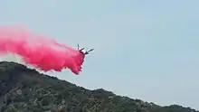 A DC-10 tanker drops fire retardant on the San Gabriel Complex Fire