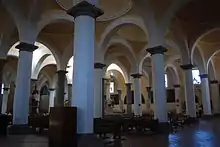 The church has one long nave, which is divided into various sections and covered by Gothic style vaults and cupola. The interior has a Latin cross layout, with Gothic ribs on the vaults and arched window openings. It conserves a number of oil paintings from the 17th and 18th centuries.[3][6] The altarpieces are Neoclassical, made of wood and plaster, painted white and decorated in gold leaf. The main altar dates from 1897 and is dedicated to the Virgin of the Remedies.[2][8]