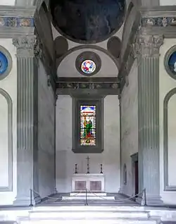 Altar with stained-glass window in the Pazzi Chapel in Florence.