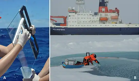 Devices used to sample the concentrations of particulates and compounds of the SML include a glass fabric, metal mesh screens, and other hydrophobic surfaces. These are placed on a rotating cylinder which collects surface samples as it rotates on top of the ocean surface.[107]