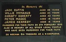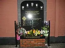 On 5 February 2002 a plaque was erected on the side of the bookmaker's shop in Hatfield Street carrying the names of the five victims and the Irish language inscription Go ndéana Dia trócaire ar a n-anamacha ("May God have mercy on their souls"). A small memorial garden was later added.[24] The unveiling ceremony, which took place on the tenth anniversary of the attack, was accompanied by a two-minute silence and was attended by relatives of the dead and survivors of the attack.[25] A new memorial stone was laid on 5 February 2012 to coincide with the publication of a booklet calling for justice for the killings.[26]