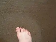 Moist sand along the shoreline is originally densely packed by the draining water. Foot pressure on the sand causes it to dilate (see: Reynolds dilatancy), drawing water from the surface into the pores.