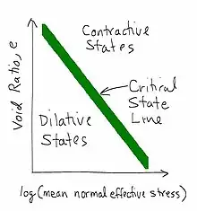 The tendency for a soil to dilate or contract depends primarily on the confining pressure and the void ratio of the soil. The rate of dilation is high if the confining pressure is small and the void ratio is small. The rate of contraction is high if the confining pressure is large and the void ratio is large. As a first approximation, the regions of contraction and dilation are separated by the critical state line.