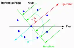 A wavefront coming from north-east and crossing a seismic array[1]