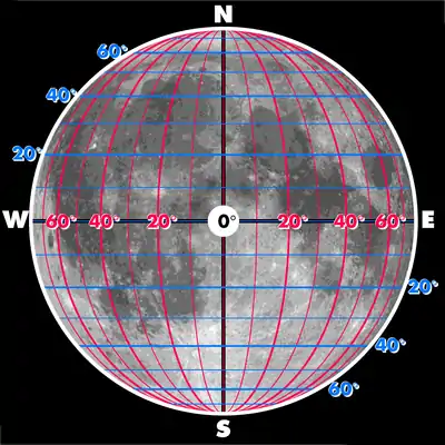The selenographic coordinate system is used to refer to locations on the surface of Earth's moon. Any position on the lunar surface can be referenced by specifying two numerical values, which are comparable to the latitude and longitude of Earth. The longitude gives the position east or west of the Moon's prime meridian, which is the line passing from the lunar north pole through the point on the lunar surface directly facing Earth to the lunar south pole. (See also Earth's prime meridian.) This can be thought of as the midpoint of the visible Moon as seen from the Earth. The latitude gives the position north or south of the lunar equator. Both of these coordinates are given in degrees.