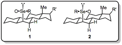 The reaction is highly trans-selective when acyclic α-phenylseleno carbonyl compounds are employed. Formation of conjugated double bonds is favored. Endocyclic double bonds tend to predominate over exocyclic ones, unless no syn hydrogen is available in the ring. Selenium in these reactions is almost always stereogenic, and the effect of epimerization at selenium (which is acid-catalyzed and occurs readily) on the elimination reaction is nearly unknown. In one example, separation and warming of selenoxides 1 and 2 revealed that 2 decomposes at 0 °C, while 1, which presumably has more difficulty accessing the necessary syn conformation for elimination, is stable to 5 °C.[6]