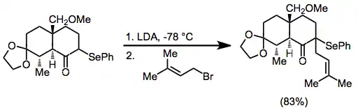 α-Phenylseleno aldehydes, which are usually prepared from the corresponding enol ethers, are usually oxidized with mCPBA or ozone, as hydrogen peroxide causes over-oxidation. α-Phenylseleno ketones can be prepared by kinetically controlled enolate formation and trapping with an electrophilic selanylating reagent such as benzeneselenyl chloride. A second deprotonation, forming a selenium-substituted enolate, allows alkylation or hydroxyalkylation of these substrates.[13]
