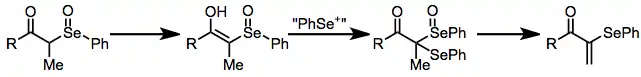 A second significant side reaction in reactions of ketones and aldehydes is selanylation of the intermediate selenoxide. This process leads to elimination products retaining a carbon-selenium bond,[16] and is more difficult to prevent than the seleno-Pummerer reaction. Tertiary selenoxides, which are unable to undergo enolization, do not react further with selenium electrophiles.